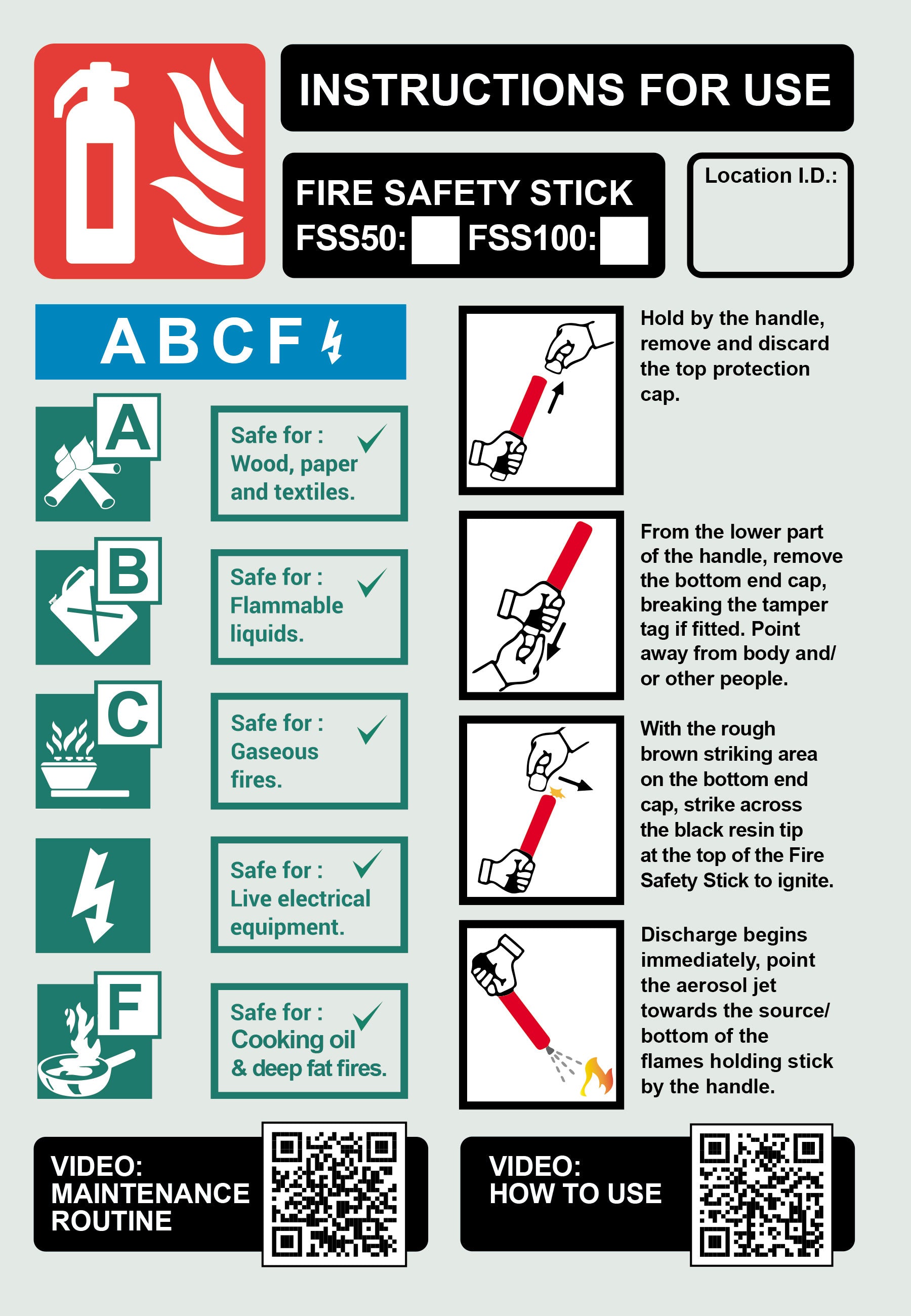 This is a rigid plastic wall sign approx 150mm x 220mm which is photo-luminescent (glow in the dark), indicating the location of the Fire Safety Stick as a fire extinguisher. Standard fire point design. Shows: Model of FSS (user ticks box with marker pen), Classes of fires it has been certified for, Instructions for use. We have also included 2x QR codes directing to "How to Use" and "Maintenance Guide". NB The signs do not come with adhesive backing.